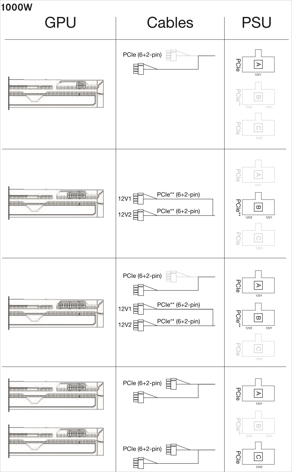 多路12V电源的接线难免要进行计算,be quiet! Pure Power 11 FM 1000W说明书中对显卡PCIe的接线方法进行了比较详细的推荐。推荐的原则是在CPU已经占用了一部分12V2的情况下尽可能让显卡使用偏向于12V1,避免12V2负载过重触发OCP过流保护。单卡单8Pin建议接到12V1的插座,双8Pin建议接到中间的插座让电流平摊给12V1和12V2,3个8Pin的显卡则使用2个12V1的插座,和1个12V2插座。双显卡则分配给左右两个插座,让12V1和12V2各自承担一张显卡的功耗。