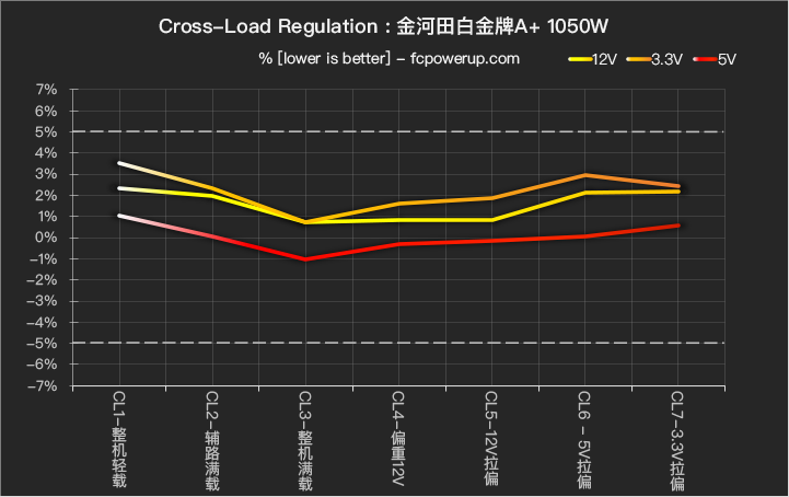 金河田白金牌A+1050W的交叉负载电压表现:12V、5V、3.3V分别为2.36%、1.06%和3.52%,5V相对好一点,12V和3.3V的轻载电压设定偏高一些。