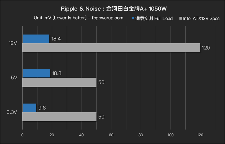 满载纹波的条形图与Intel规格上限对比,数值越低越好