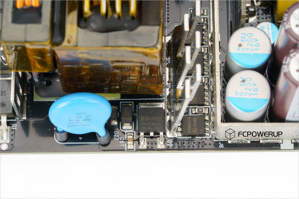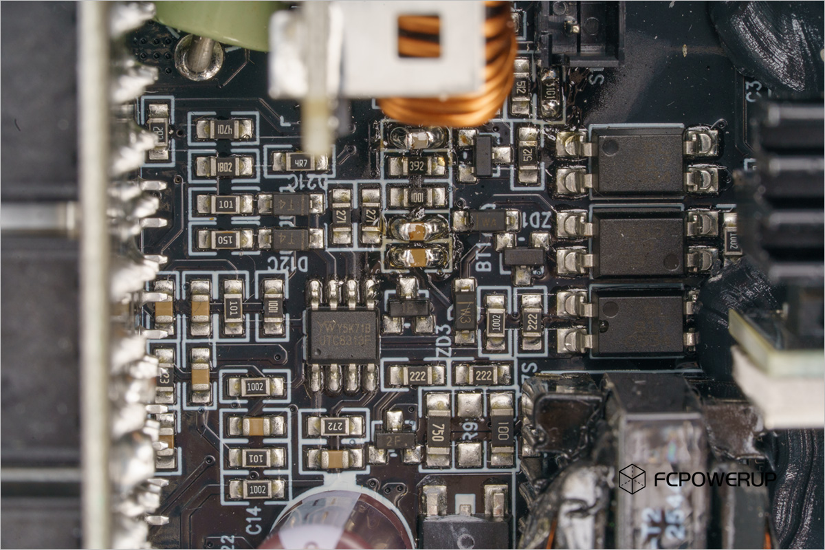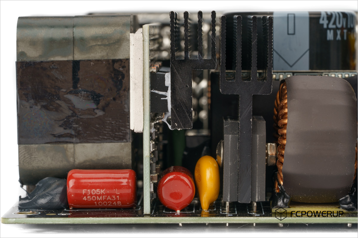 联力SX1200P由中原电脑代工,采用的是目前流行的正打SMD工艺,拓扑为主动PFC+LLC谐振+12V同步整流+5V/3.3V DC-DC生成。主控为MPS HR1213 ( LLC + PFC )。做工整洁、规范,EMI电路元件齐全。主动PFC电路的功率器件也使用了最近流行的表面特装式封装,背面通过导热垫加上散热片进行散热,正面也辅以导热硅脂和散热片进行散热,这样一来功率管的两个方向都进行了散热,对生产、组装和整体散热性能都可以起到比较好的效果,缺点是不好拆卸和维修(也看不到详细的元器件规格),但整体还是正收益的。