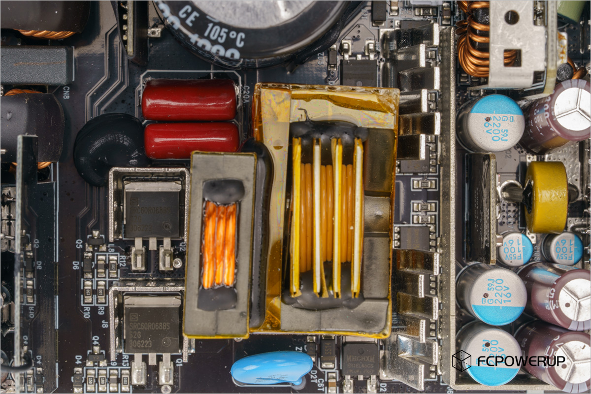 功率管子方面,能看到的型号基本都来自国产品牌,比如LLC用的尚阳通Sanrise Tech的元件,12VSR用的东微半导体Oriental,5V/3.3V DC-DC用的美浦森半导体Msemitek的元件,国产元件在近几年的性能和可靠性也都上来了,功率元件用国产品牌,这也是一种趋势。