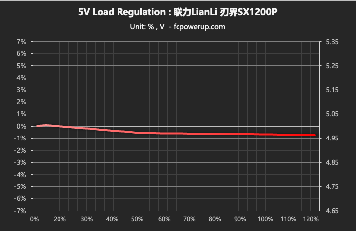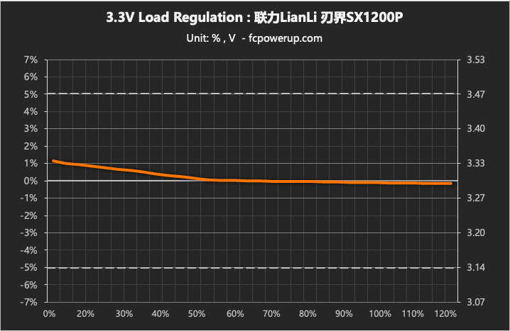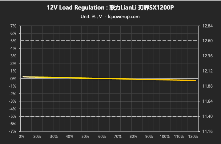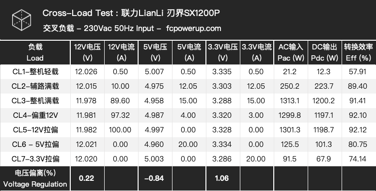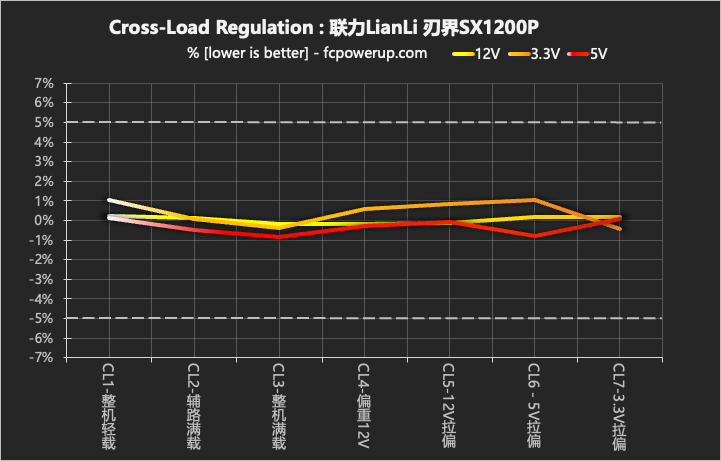联力SX1200P的交叉负载电压曲线,电压曲线越平缓代表电源电压稳定性越好: