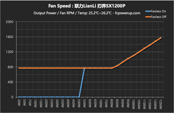噪音测试时的背景底噪为25.0dBA,测量麦克风距离电源进风口10cm。400W输出时风扇仍未开始工作,600W输出风扇开始工作时测得声压值为37dBA,此时风扇转速约770RPM,1200W满载输出,风扇转速约1490RPM,此时的噪音声压值约53.4dBA。电源整体噪音属于中上水准,在后半段大于1000W输出阶段,风扇转速会明显提高,也带来明显的风噪。