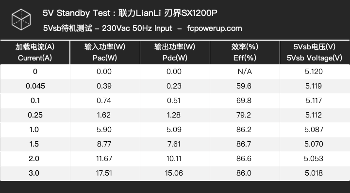 实测联力SX1200P的5Vsb待机效率能符合欧洲Erp Lot6 2013标准。