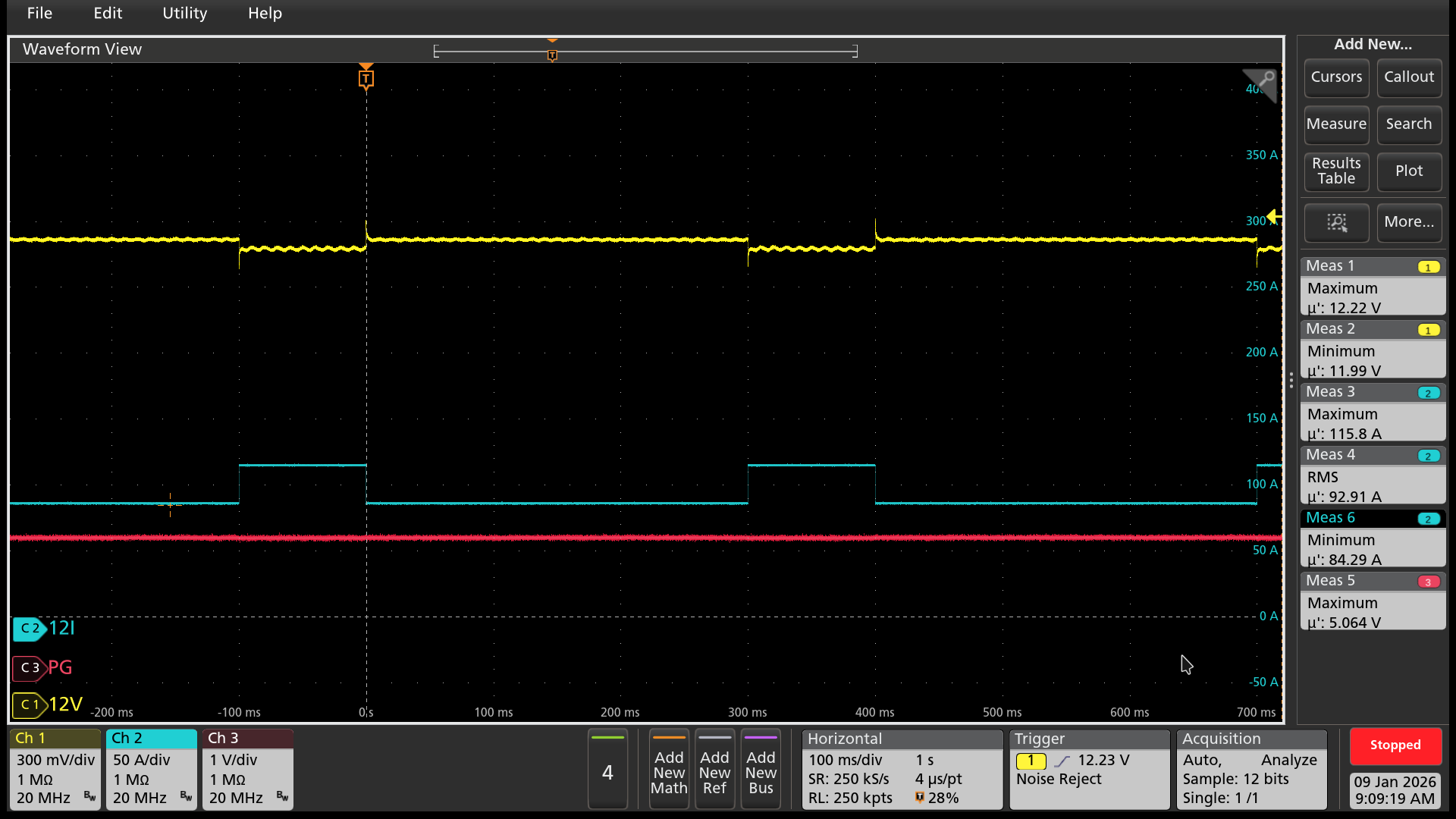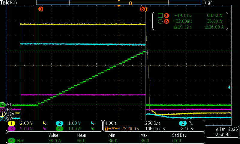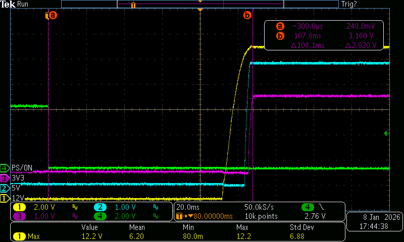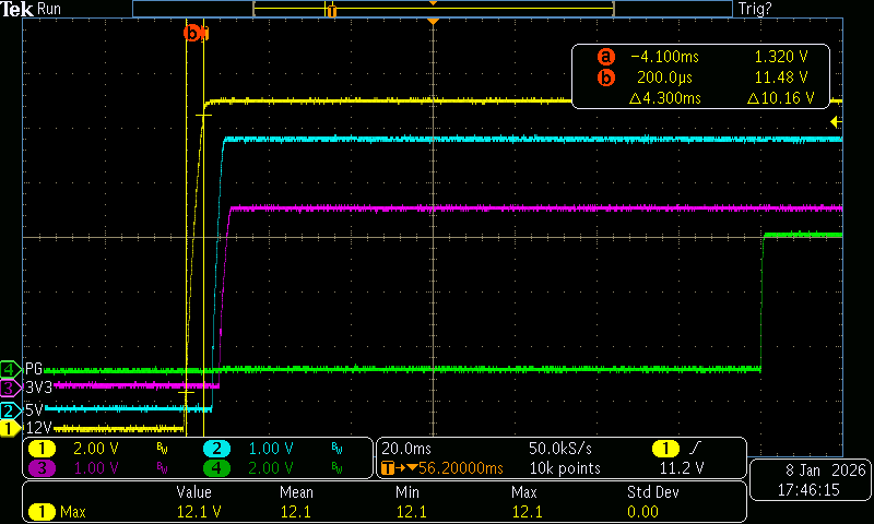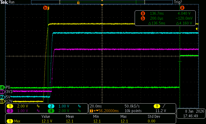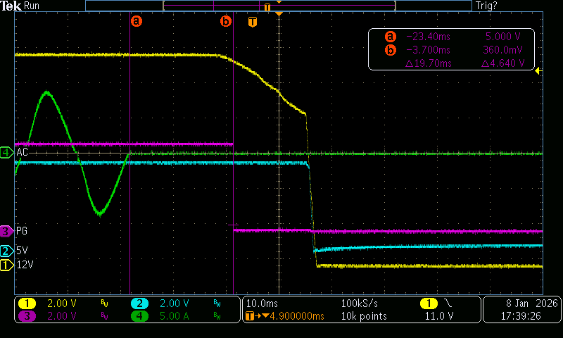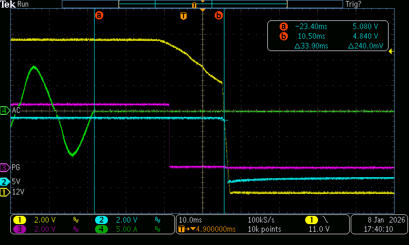 从上往下的示波器截图依次为12V、5V及PWR_OK的掉电保持时间截图。