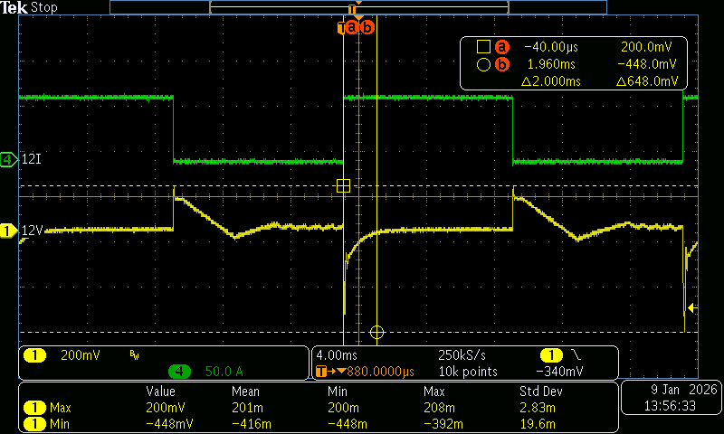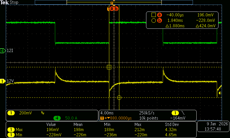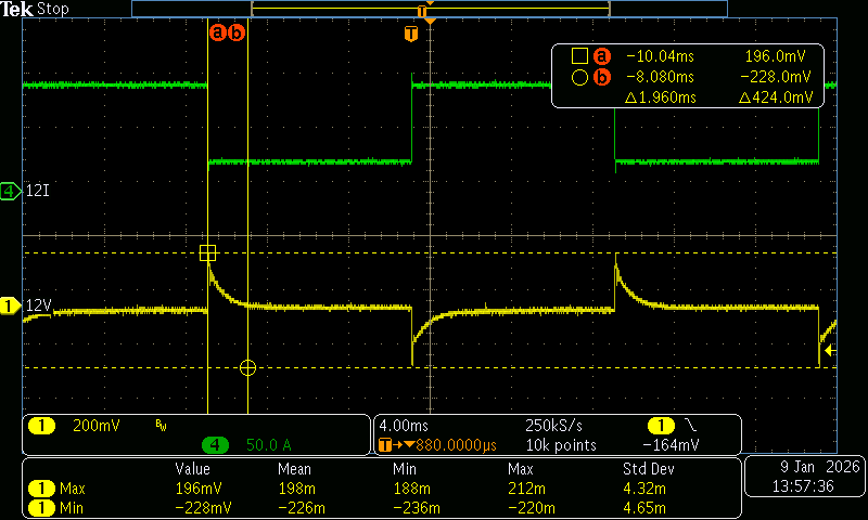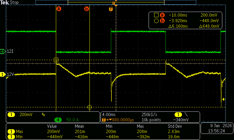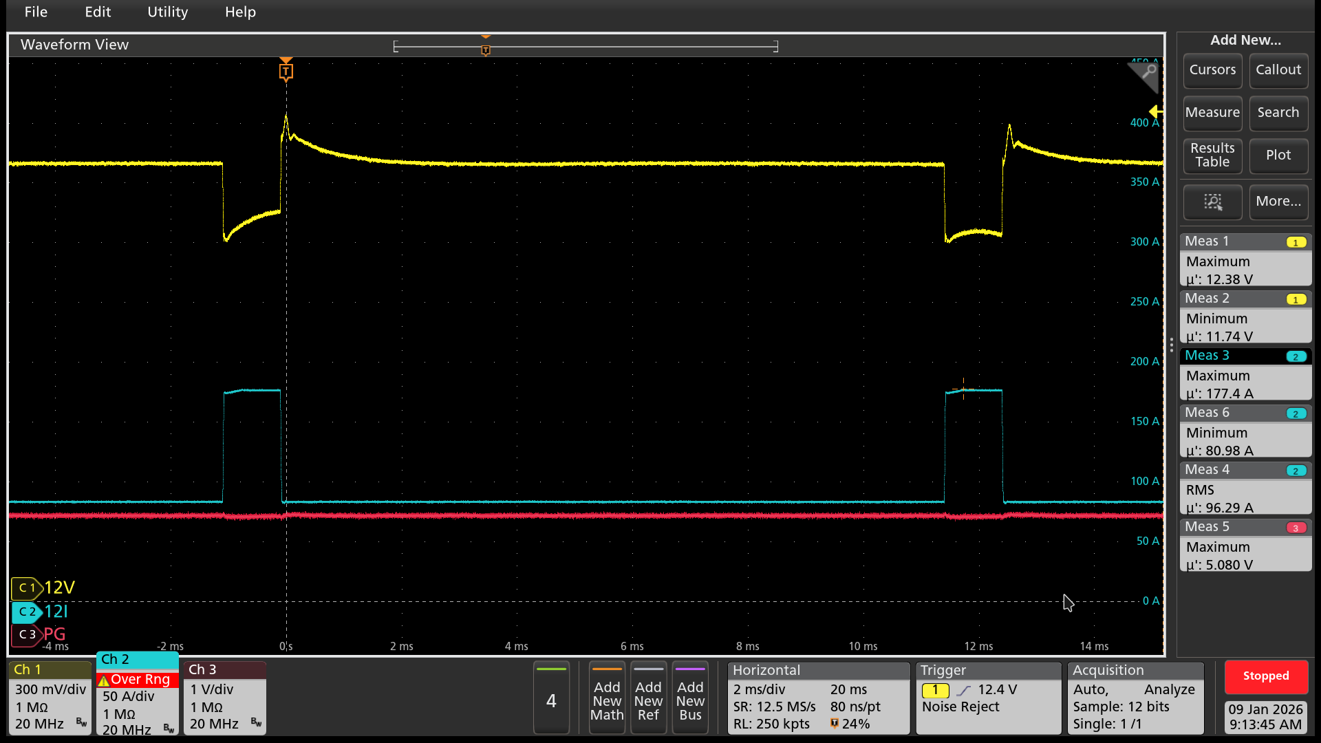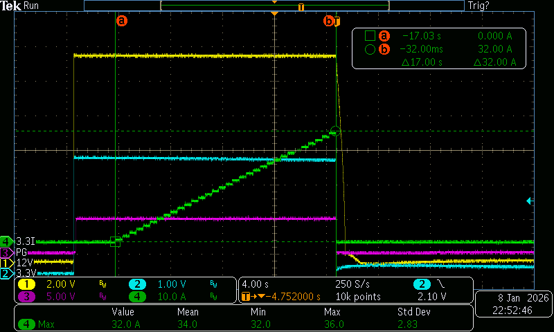 从上往下的示波器截图依次为12V、5V及PWR_OK的掉电保持时间截图。