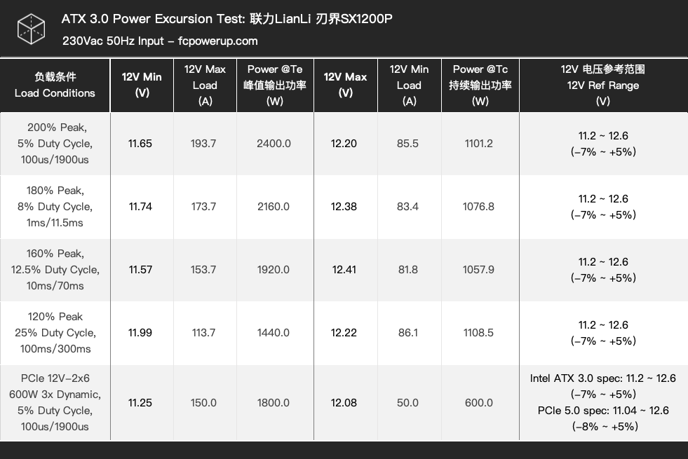 按Intel PSDG 2.1a / ATX 3.1设计指南,1200W的电源的12V-2×6接口为600W档的配置,测试下来5个档位的电压都能落在ATX3.0/PCIe 5.0要求的范围内,电源测试结果如下。