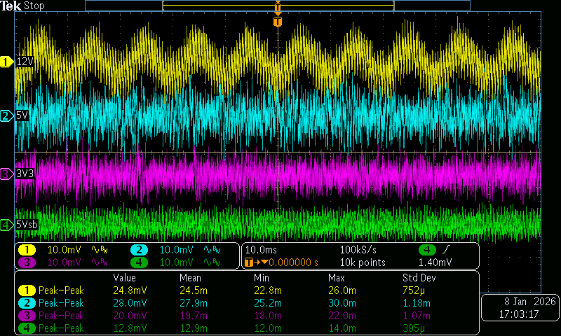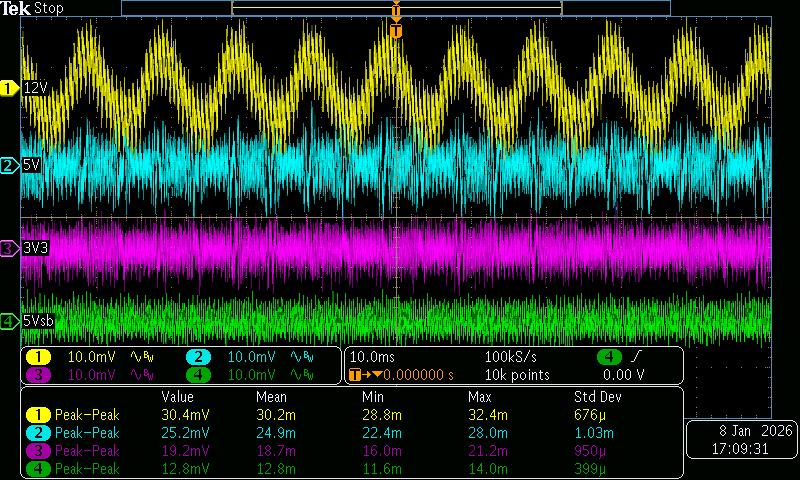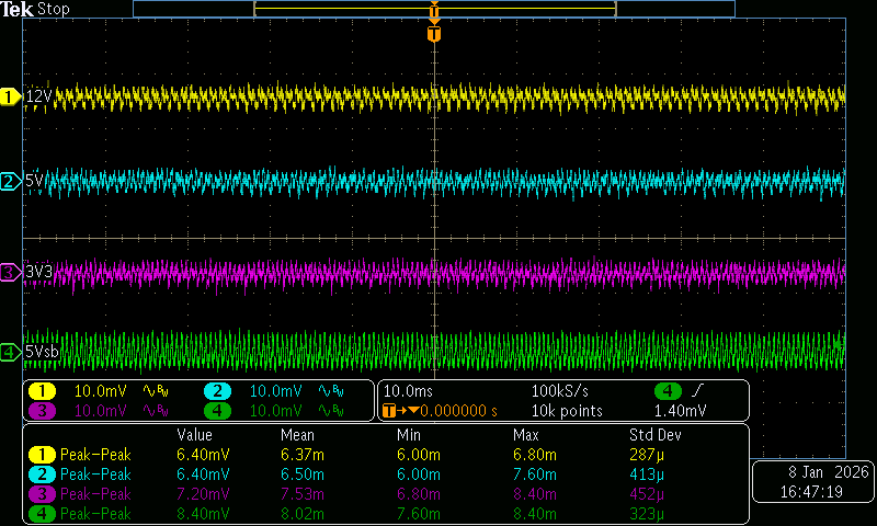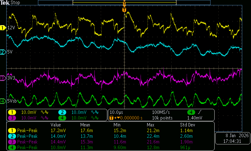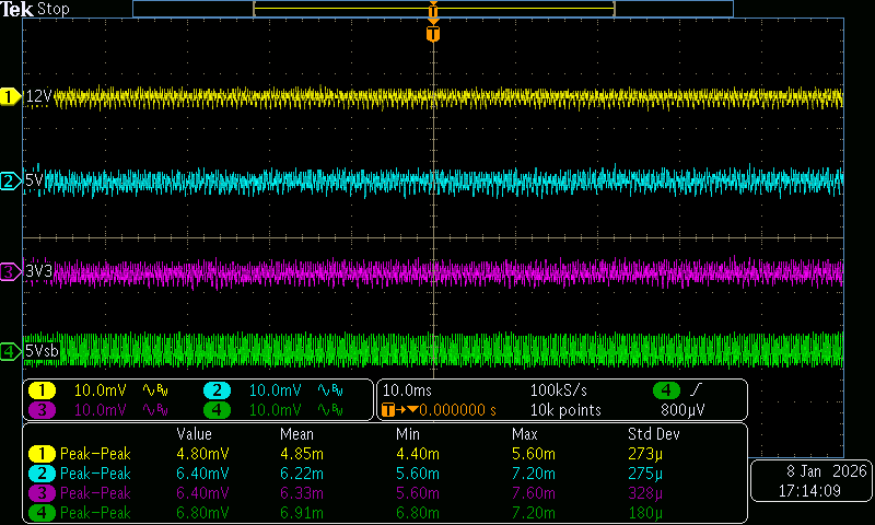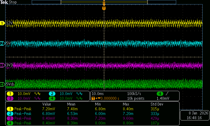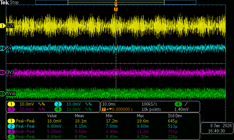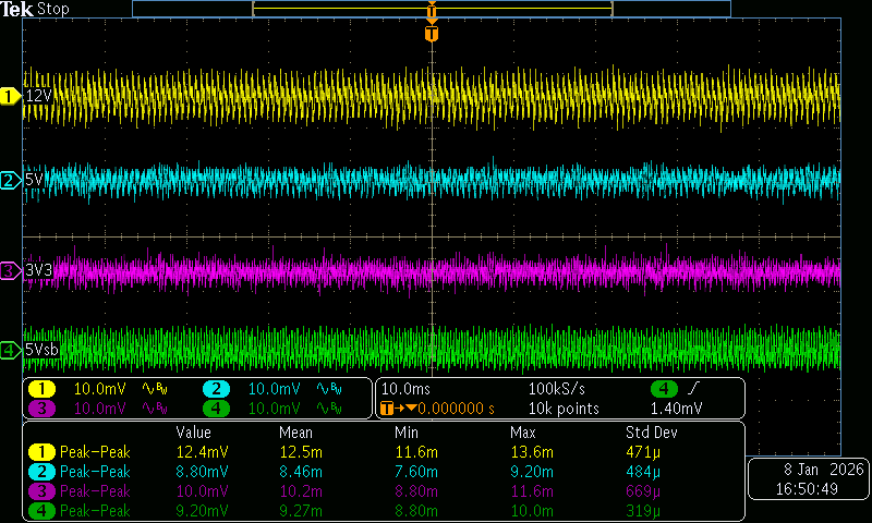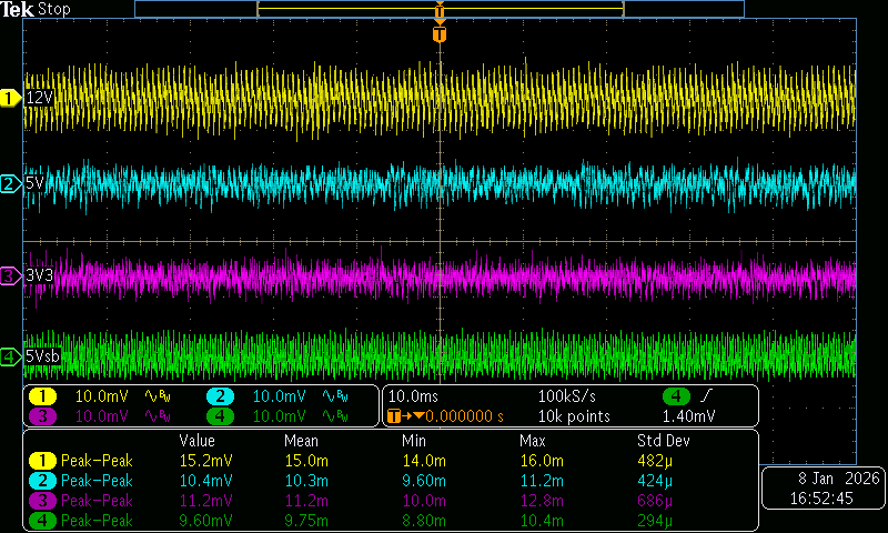 通道1、2、3、4(黄色、青色、洋红、绿色)从上往下依次是12V、5V、3.3V和5Vsb的纹波。