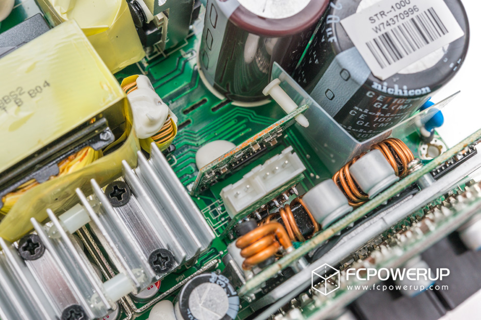 主电容为Nichi-Con LGL系列 400V / 820uF + Nippon Chemi-Con CE系列 400V / 450uF 总计1270uF / 2000h @105℃,应对1000W的输出功率超过1μF/1W的用量。