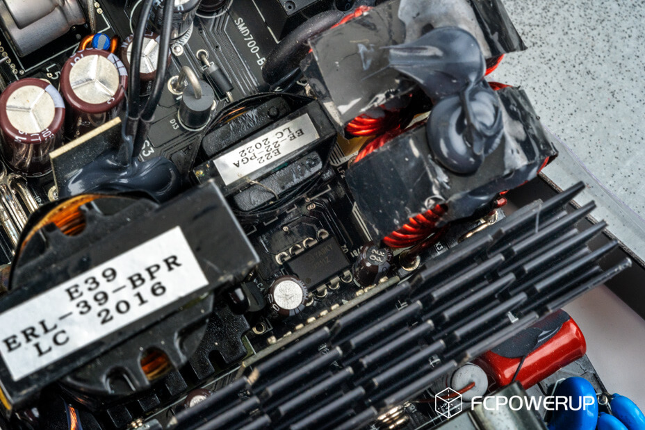鑫谷昆仑KL750G的外壳长度为18cm,直接沿用昆仑KL1080的外壳,内部PCB长度12.5cm,内部空间相当宽裕。鑫谷这一方案使用的是APFC+半桥LLC谐振+12VSR+5V/3.3V DC-DC生成的结构。PCB为双面FR4材质,模组接线板子板采用直接焊接在主PCB上的形式,但又没完全焊在主PCB上,一部分信号反馈线还是通过线缆焊接的方式连接到主PCB的管控电路。