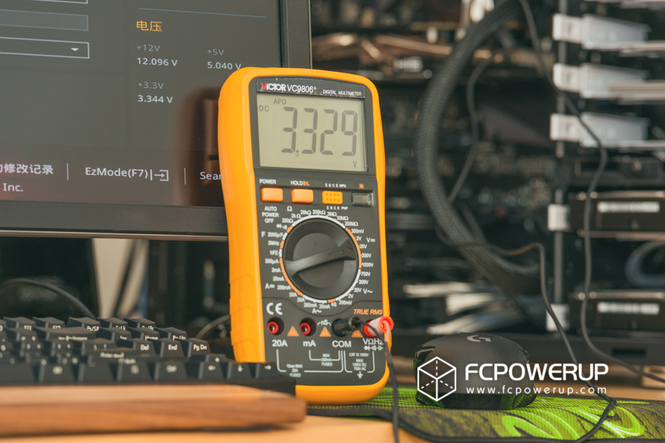 3.3V的情况,OCCT显示3.33到3.34V跳动,AIDA64显示3.328到3.344V两个值来回跳动,万用表显示3.329V到3.330V跳动。
